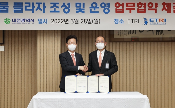 [충청뉴스큐] 대전시는 28일 한국전자통신연구원 대회의실에서 허태정 대전시장과 한국전자통신연구원 김명준 원장이 참여한 가운데 ‘마중물 플라자 조성 및 운영 업무협약’을 체결했다고 밝혔다.