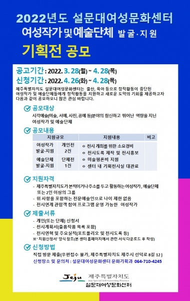 [충청뉴스큐] 제주특별자치도 설문대여성문화센터가 올해 여성작가 및 예술단체를 대상으로 전시 개최를 위한 소요경비와 홍보 등을 지원하는 기획전을 공개 모집한다.