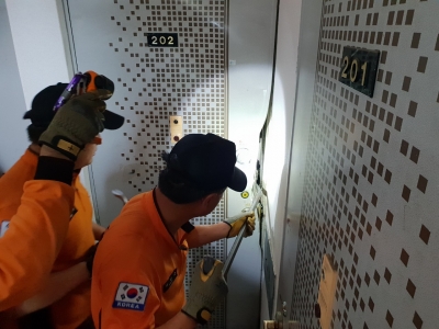 훈련은 현관문 파괴기, 도어오프너, 만능 도끼 등 구조장비를 이용해 현관문 도어록 방화문 보조키 현관문 걸림쇠 등을 파괴하는 순서로 진행된다.
