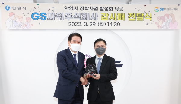 [충청뉴스큐] 안양시는 3월 29일 GS파워주식회사에 안양시 장학사업 활성화 유공 감사패를 전달했다.