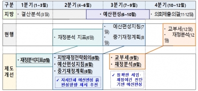 행안부는 지자체의 확장적 재정운영과 함께 예산을 계획적으로운영할 수 있도록, 지방교부세 통보를 기존 12월에서 9월로 앞당기는 등 지방재정 제도의 일정을 전면적으로 개편할 계획이다.