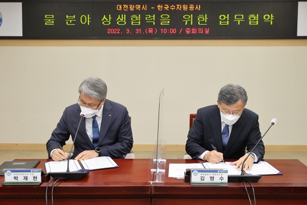 [충청뉴스큐] 대전시는 31일 대전시청에서 한국수자원공사와 물분야 상생협력을 위한 ‘물분야 상생협력 업무협약’을 체결하고 글로벌 혁신성장 중심지로 도약과 지속 가능한 상호 발전을 위해 긴밀하게 협력하기로 했다고 밝혔다.
