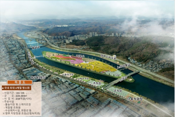 권영진 대구시장은 “지난해까지는 하중도 접근로 확장과 편의제공을 위한 기반시설 조성을 완료해 관광객들에게 여가공간과 즐길거리 제공하고 내년부터는 사계절 초화원, 수상레저시설, 지방정원을 체계적으로 조성해 국내 최대 4계절 관광명소로 마련해 나가겠다”고 포부를 밝혔다.