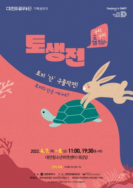 [충청뉴스큐] 대전시립무용단은 원도심 활성화와 어린이들에게 문화 예술을 향유하고 꿈을 키우는 ‘꾸석꾸석 춤동화, 토생전’공연을 오는 4월 7일부터 8일 2일간 대전청소년위캔센터 대강당에서 개최한다고 밝혔다.