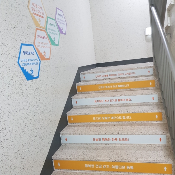 건강계단은 계단 오르기 ‘3.8.3 운동법’과 계단 오르기의 효과 일상 속 에너지 절약 방법 우울증 예방법 등 주민들에게 다양한 건강정보와 볼거리를 함께 제공해 계단을 오르며 건강생활실천을 함께할 수 있는 디자인으로 구성했다.