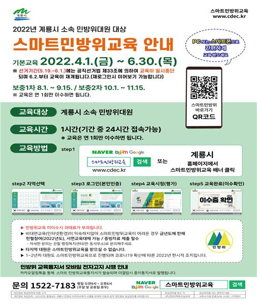 [충청뉴스큐] 계룡시는 4월 1일부터 오는 6월 30일까지 2개월 간 ‘2022년 민방위 사이버교육’을 실시한다고 밝혔다.