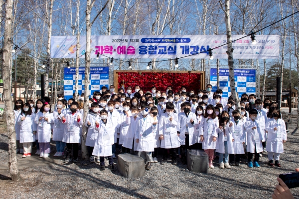 [충청뉴스큐] 제천시인재육성재단은 지난 2일 제천한방엑스포공원 자작나무숲에서 ‘2022년 과학·예술 융합교실’ 개강식을 개최했다.