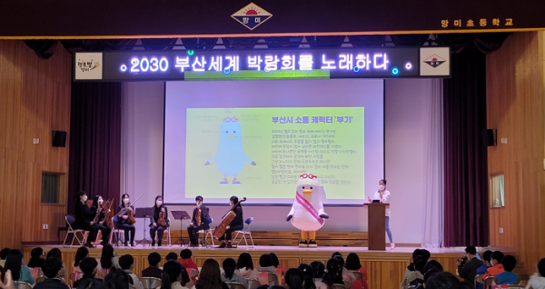 특히 부산시립청소년교향악단과의 협업으로 생생한 연주를 직접 경험하게 하고 전문강사가 초등학생 눈높이에 맞추어 엑스포를 알기 쉽게 설명해 지난 1일 첫 번째로 교육을 진행한 망미초등학교 교사와 학생들의 열렬한 호응을 받았다.