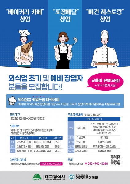 [충청뉴스큐] 대구시는 실전에 강한 외식산업 미래인재 양성을 위해 ‘외식창업 키워드림 아카데미’를 개설, 오는 22일까지 교육 참가자를 모집한다.