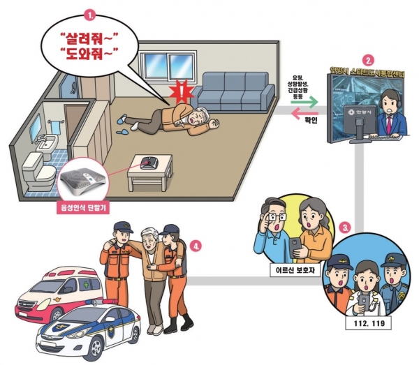 스마트도시통합센터 관제요원이 365일 24시간 모니터링, 응급상황 발생시‘사람 살려’와 같은 어르신의 목소리를 인지해 직접 통화하고 상황별로 119 · 112로 연락해 어르신 가정에 신속 출동하는 시스템이다.