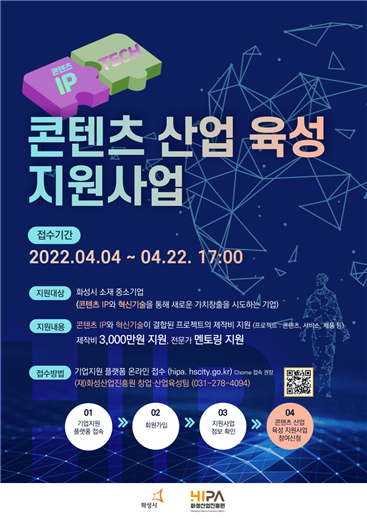 4일부터 모집하는 ‘2022년 콘텐츠 산업 육성 지원사업’을 통해 화성시 관내 유망 콘텐츠 기업을 발굴·육성함으로써 IP 밸류체인 시장에서의 경쟁력 강화에 집중하겠다는 목표다.