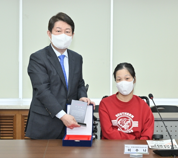 [충청뉴스큐] 4일 오전 11시 시청별관 대회의실에서 대구탈시설장애인자조모임은 민선 6기·7기에 탈시설 장애인 자립지원정책을 선도적으로 추진해 주신 것에 대해 감사한 마음을 담아 권영진 대구시장에게 감사패를 전달했다.