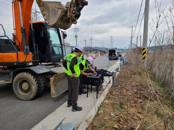 이곳에서는 도로 가드레일 시공 적정 여부를 중점적으로 확인하기 위해 ‘가드레일 지주의 수평지지력시험’을 진행했다.