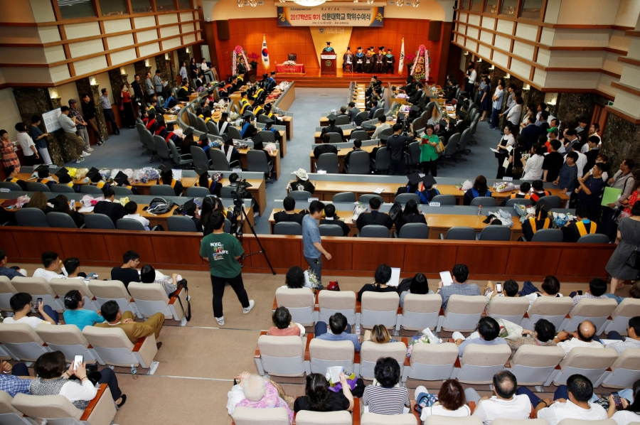 선문대학교(총장 황선조)는 16일 국제회의실에서 황선조 총장, 장민수 대학원장, 유기준 총동문회장 등을 비롯해 학부모와 축하객 등 500여 명이 참석한 가운데 2017학년도 후기 학위수여식을 개최했다. 이날 박사 18명, 석사 77명, 학사 371명 등 총 466명이 학위를 받았다. 아울러 이사장상은 박상록(기계ICT융합공학부), 총장상은 이승근(BT융합제약공학과) 외 4명, 공로상은 추능런(Chu Loung Luan・일반대학원 이학박사), 정하민(하이브리드공학과) 외 5명, 단과대학장상은 이은선(언론광고학부) 외 4명이 수상했다. 학위수여식은 조인국 대학원교학팀장의 사회로 김종해 교무처장의 학사보고, 황선조 총장의 학위증서와 상장 수여로 진행됐다. 황선조 총장은 졸업식사에서 “여러분들은 ‘자기주도 생애설계의 교육모델’을 중심으로 교육과정을 이수하면서 자신만의 스토리를 만들었다”면서 “우리 대학에서 배운 섬김과 배려의 ‘인격자’, 소통과 나눔의 ‘세계시민’, 창의와 융합의 ‘전문인’의 3대 교육목표를 깊이 새기길 바란다”고 당부했다. 마지막으로 “미래를 향해 도전한다면 실패할 수도 있지만, 도전하지 않으면 결코 성공할 수 없다”면서 “선문인으로서 긍지와 자부심을 갖고 세계를 무대로 도전하면서 꿈을 펼치는 주인공이 되길 바란다”며 졸업생들을 격려했다. 한편 올해로 건학 46주년을 맞이한 선문대는 교육부 1주기 대학구조개혁평가 최우수 A등급(충남・대전・세종에서 유일)에 이어 2주기 대학기본역량진단 평가에서 예비 자율개선대학으로 선정되는 등 높은 평가를 받고 있다. 2017년 교육부 발표 전국 취업률 2위(‘나’ 그룹), 학생 1인당 평균 장학금 421만 원 등 교육여건 전국 5위를 달성하기도 했다.