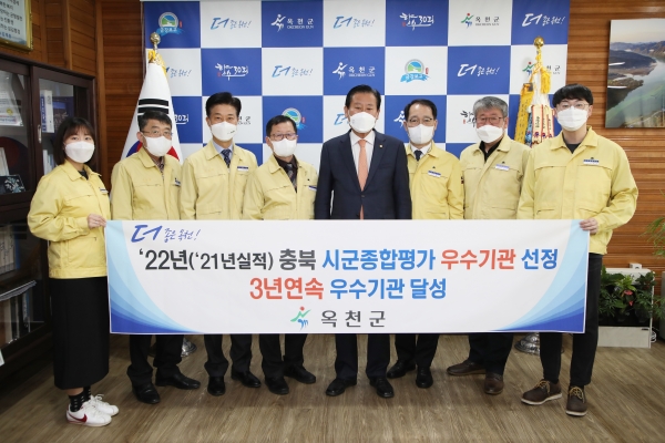 [충청뉴스큐] 옥천군은 충청북도 주관 시군종합평가에서 2020년‘우수’, 2021년‘최우수’에 이어 올해‘우수’로 선정되며‘3년 연속 우수기관’으로 선정되는 쾌거를 이뤘다.