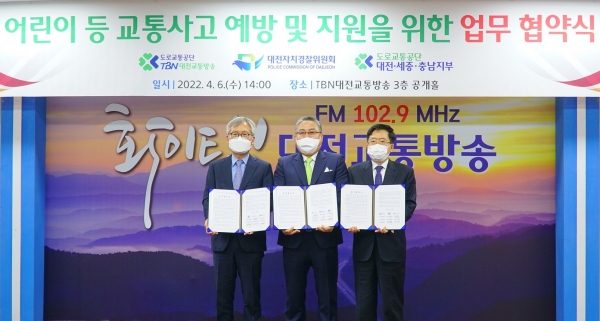 [충청뉴스큐] 대전자치경찰위원회는 6일 TBN 대전교통방송 공개홀에서 도로교통공단 대전·세종·충남지부와 TBN 대전교통방송과 함께 “어린이 등 교통사고 예방 및 지원을 위한 상호협력 업무협약”을 체결했다.