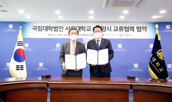 최대호 안양시장과 오세정 서울대학교 총장이 7일 서울대 관악캠퍼스에서 관악수목원 전면 개방에 공동 노력할 것을 다짐하는 교류협력 협약식을 가졌다고 안양시가 밝혔다.