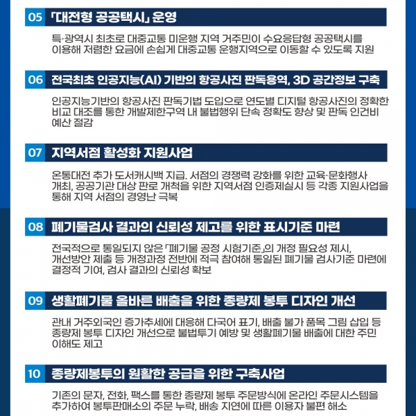 우수사례 후보는 대전시 한방난임치료비 지원사업 디지털 격차해소를 위한 디지털코디네이터 운영 지능형 환경질환 리빙랩 플랫폼 구축사업 전국 최초, 최첨단 구급대원 전문교육 훈련센터 설치 · 운영 대전형 공공택시 운영 등 공무원의 적극적 문제해결 노력과 구체적 성과가 나타난 정책과 사업들이다.