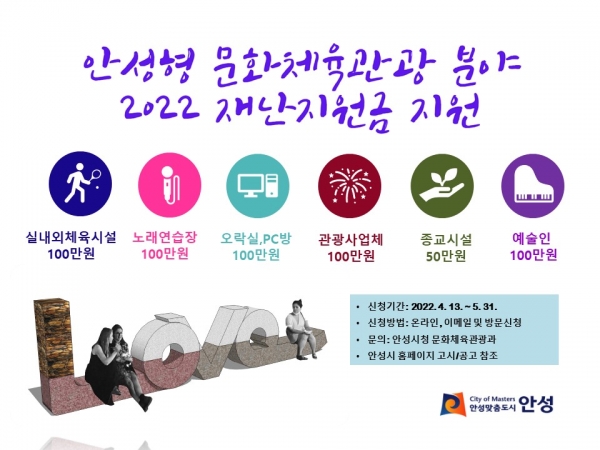[충청뉴스큐] 안성시는 코로나19로 경제적 어려움을 겪고 있는 지역 문화체육관광 분야에 대해 맞춤형 재난지원금을 지급한다고 밝혔다.