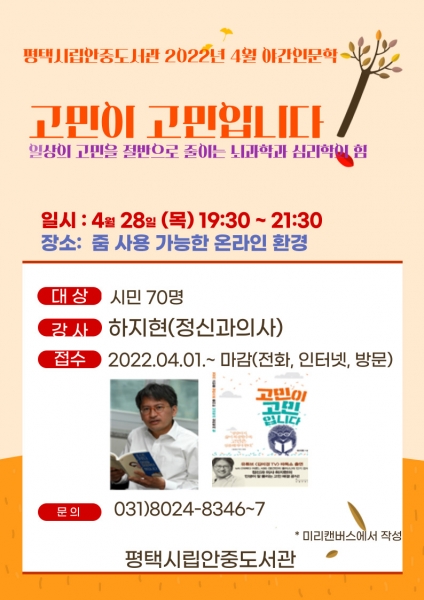[충청뉴스큐] 평택시립안중도서관은 2022년 4월 야간인문학 하지현 작가의 ‘고민이 고민이다’를 운영한다.