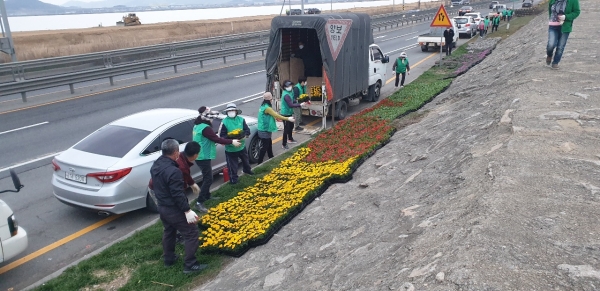[충청뉴스큐] 평택시 현덕면행정복지센터는 지난 7, 8일 봄을 맞아 평택호 방조제 이용객들에게 화사한 볼거리를 선사하는 평택호 방조제 꾸미기를 실시했다.