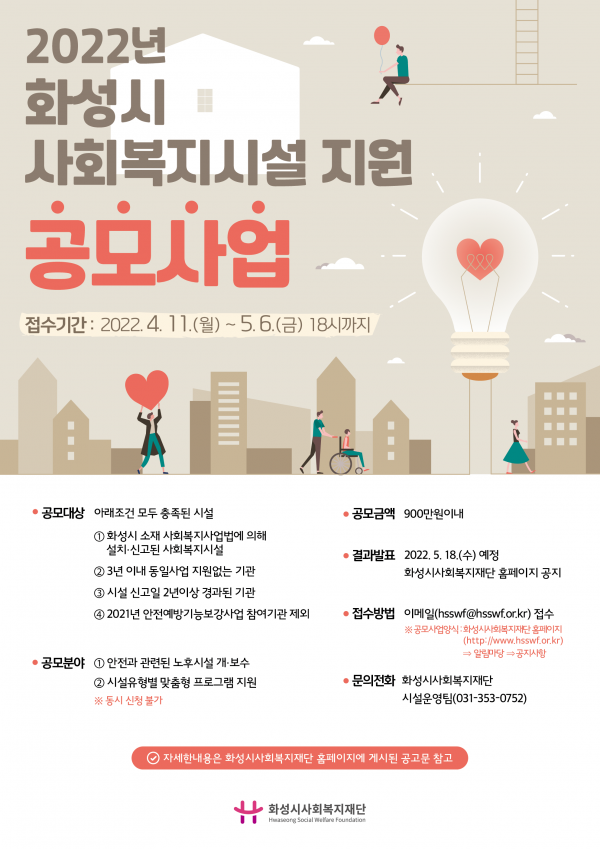 [충청뉴스큐] 화성시사회복지재단은 2022년 ‘사회복지시설 지원 공모사업’을 이달부터 다음달 6일까지 접수한다고 12일 밝혔다.