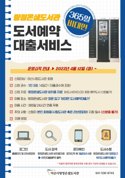 [충청뉴스큐] 아산시 탕정온샘도서관이 오는 12일부터 코로나19 등 감염병으로부터 안전한 365일 24시간 비대면 방식의 무인 도서예약대출서비스를 제공한다.