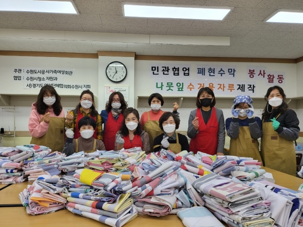 이에 회관은 수원시청소자원과, 수원시여성단체협의회, 수원시민 자원봉사자 70여명 등 민관협의체를 구성해 ‘탄소중립 실천을 위한 폐현수막 재활용 사업’을 전개했다.