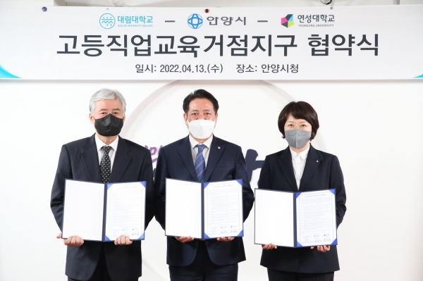 이에 따른 협약식이 13일 안양시청에서 열려, 최대호 안양시장·권민희 연성대 총장·황운광 대림대 총장이 고등직업교육거점지구 지정에 함께 노력할 것을 약속하는 양해각서를 교환했다.