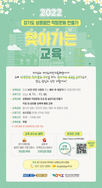 양정선 경기도여성가족재단 정책사업실장은 “교육 접근성이 낮은 소규모 사업장 및 예비 취·창업자 대상으로 찾아가는 교육을 실시해 성인지 감수성을 높이고 교육 사각지대를 해소하겠다”고 말했다.