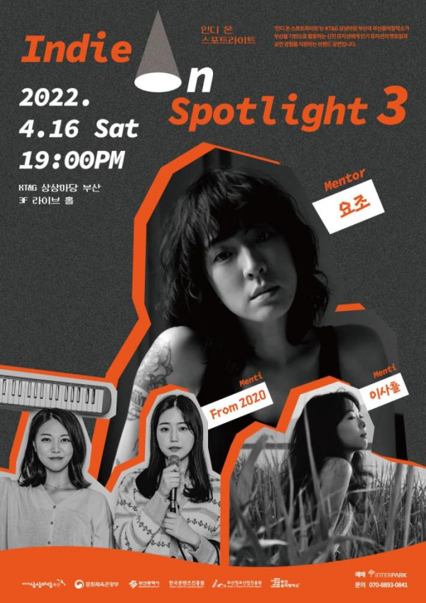 [충청뉴스큐] 부산시는 오는 16일 오후 7시 부산진구 소재 KT&G 상상마당 부산 라이브 홀에서 부산에서 활동하는 인디뮤지션을 위한 공연 프로젝트 ‘인디 온 스포트라이트3’를 개최한다고 밝혔다 ‘인디 온 스포트라이트’는 부산을 기반으로 활동하는 신진 인디뮤지션들에게 유명뮤지션의 멘토링과 공연 기회를 제공해 다음 단계로의 성장을 지원하는 브랜드 공연이다.