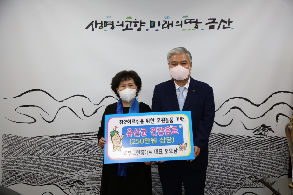 [충청뉴스큐] 금산 추부면에 소재한 그린홈마트는 지난 13일 지역의 어려운 이웃을 위해 사용해 달라며 250만원 상당의 유산균 건강음료를 기탁했다.
