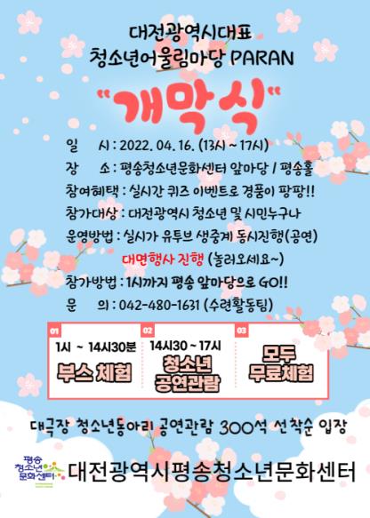 [충청뉴스큐] 대전시는 오는 16일에 대전평송청소년문화센터에서 ‘2022년 청소년어울림마당’을 개막한다고 밝혔다.