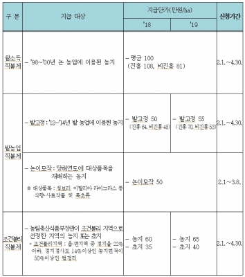 밭농업직불금 중 논 이모작은 전년과 동일한 1ha당 50만 원이다. 밭고정직불금 지급단가는 전년보다 5만 원 인상돼 평균 55만 원이며, 농업진흥지역은 70만 원, 비진흥 지역은 53만 원이다.