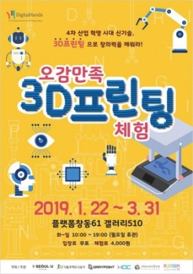 [충청뉴스큐] 플랫폼 창동 61에서 겨울방학을 맞아 온 가족이 함께 즐길 수 있는 "오감만족 3D 프린팅 체험"전시가 진행된다. 3D 프린팅 기술을 활용한 다양한 작품을 만나볼 수 있는 이번 전시는 3D 프린터의 다양한 출력 방식과 4차 산업혁명시대의 미래직업을 탐구해보고 피규어 같은 소형 작품에서 조명, 테이블, 의자 등 대형 작품까지 실제 3D 프린터로 제작된 작품들을 관람할 수 있다.