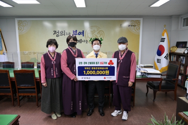 박정현 부여군수 또한 “우리도 1987년 수해피해를 겪어 봤기에 이번 산불피해를 보며 안타까운 마음이 크다”며 “이번 기부가 갑작스런 산불로 어려움을 겪고 있을 주민들의 일상회복에 큰 도움이 될 것”이라고 감사의 말을 전했다.
