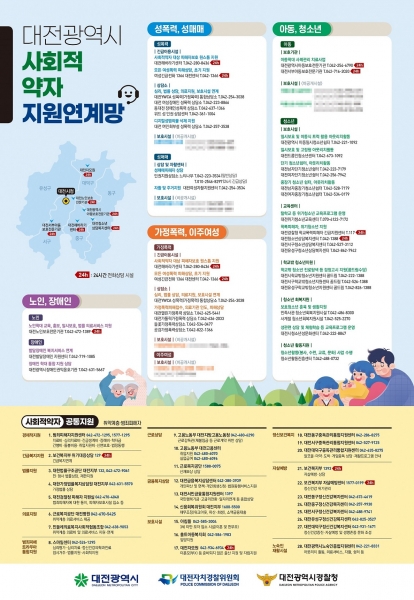 ‘종합안내도’는 성폭력·가정폭력·아동학대 피해자 등 사회적약자를 지원하는 대전광역시 내 77개 유관기관의 업무범위 및 연락처를 한눈에 볼 수 있도록 총망라해 구성됐다.