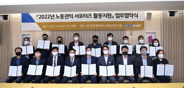 경기도는 20일 경기도청 북부청사에서 고용노동부 경기지청 및 12개 시군, 편의점 프랜차이즈 5개 사, ㈜BGF리테일 ㈜코리아세븐·롯데씨브이에스711, 이마트24)와 ‘노동권익 서포터즈 활동지원 업무협약’을 체결했다.