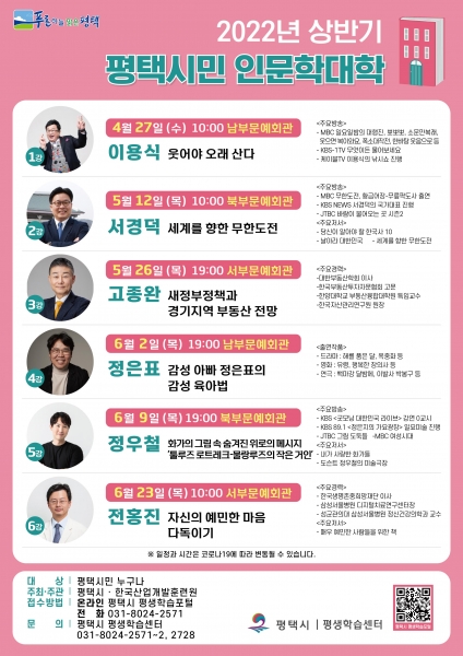 이번 2022년 평택시민인문학대학은 주간 6회, 야간 6회 진행되며 제1강 이용식 개그맨의 ‘웃어야 오래 산다’ 강연을 시작으로 12인의 초청 명사가 건강, 역사, 미술 등 다양한 주제로 삶의 지혜를 전달할 예정이다.