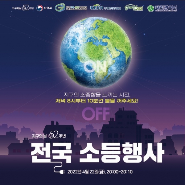 [충청뉴스큐] 대전시는 제52회 지구의 날을 맞아 22일 저녁 8시부터 10분 간 공공건물 및 지역상징물 등을 대상으로 소등행사를 실시한다고 밝혔다.