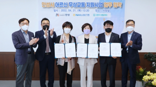 [충청뉴스큐] 안성시는 21일 65세 이상 어르신을 위한 무상교통 지원사업을 원활히 추진하기 위해 농협은행 안성시지부, 로카모빌리티와 업무협약을 체결했다.