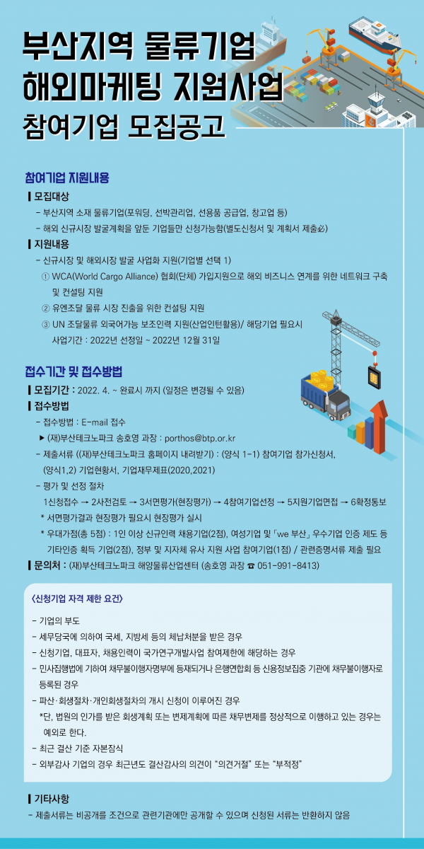 [충청뉴스큐] 부산시는 부산테크노파크와 함께 ‘물류기업 해외마케팅 지원사업’을 추진하고 지원사업에 참여할 기업을 모집한다고 밝혔다.