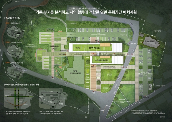 이와 함께 주차장 부지에는 음악회 등 공연이 가능한 행사마당, 어린이들의 놀이공간인 어울림마당, 주민들이 함께 잔디·꽃밭을 관리하는 치유원예정원 등이 조성된다.