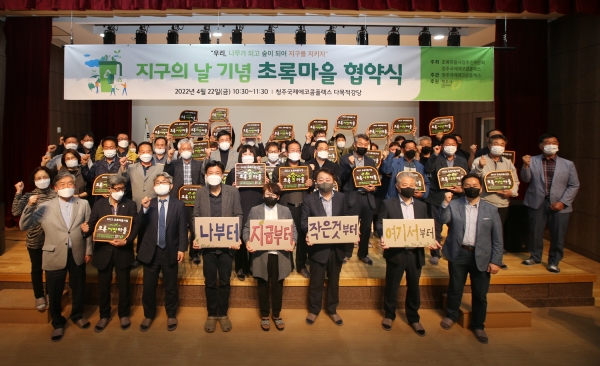 [충청뉴스큐] 청주시와 청주국제에코콤플렉스, 초록마을사업추진위원회는 22일 청주국제에코콤플렉스에서 ‘지구의 날’을 기념하며 올 한 해 동안 초록마을사업에 참여할 40개소의 마을주민과 추진위원 등 100여명이 참석한 자리에서 초록마을 협약식을 개최했다.