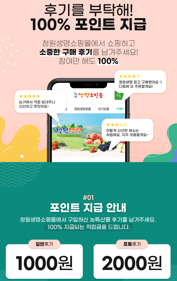 시 관계자는 “포인트 지급 이벤트는 청원생명쇼핑몰을 통해 저렴하게 농산물을 구입하는 소비자뿐만 아니라 생산자에게도 큰 힘이 될 수 있을 것으로 기대한다”며 “유통환경 변화에 맞춰 다양한 품목을 입점하고 더 활발한 이벤트를 추진해 농가와 소비자가 상생할 수 있는 농산물 유통 플랫폼을 만들어 가겠다”고 말했다.