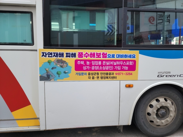 이에 군은 풍수해보험 가입 독려를 위해 시내버스 안전캠페인, 재해문자 전광판, 리플릿 배부 등 다양한 방법으로 홍보하고 있다.
