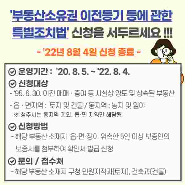 [충청뉴스큐] 청주시는 2020년 8월 5일부터 2년간 한시적으로 시행하고 있는 ‘부동산 소유권 이전등기 등에 관한 특별조치법’이 8월 4일 기준으로 신청 종료를 앞두고 있어 시민들의 조속한 신청을 당부했다.
