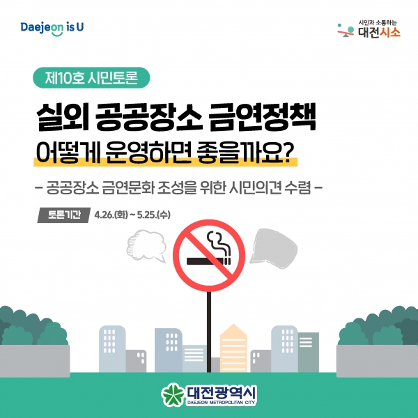 [충청뉴스큐] 대전시는 정책제안 플랫폼 ‘대전시소’에서 ‘실외 공공장소 금연정책, 어떻게 운영하면 좋을까요?’라는 주제로 한달 간 시민들의 다양한 의견을 수렴한다고 26일 밝혔다.