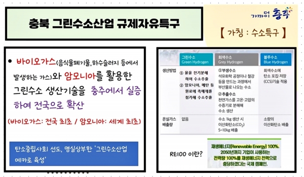 이에 비해 충주시 수소특구의 그린수소는 생산과정 중 온실가스 배출량이 제로인 친환경 청정수소로서 미래 친환경에너지의 진정한 문을 열 수소산업의 도달점으로 평가받고 있다.
