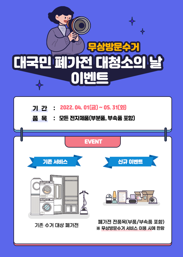대상 품목은 가정에서 장기 보관·방치 중인 폐가전 제품으로 부속품, 보조배터리, 충전기 등 초·소형 폐제품까지 포함한다.